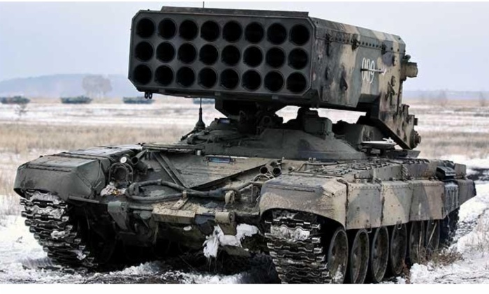 Gambar yang diunggah warga sipil Ukraina sepertinya menunjukkan kalau Rusia telah mengerahkan TOS-1 Buratino, sebuah kendaraan mirip tank yang dilengkapi dengan 24 roket berhulu ledak termobarik. Satu kali tembakan salvo dari satu unit TOS-1 itu akan mencakup sebuah wilayah seluas 200×300 meter.