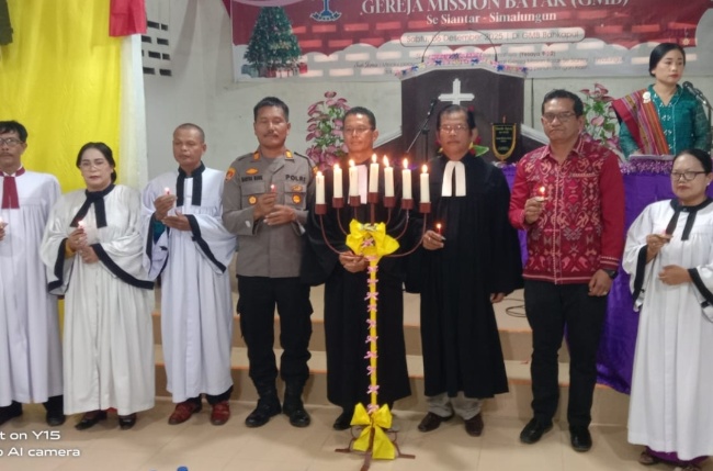 P. SIANTAR (mimbarsumut.com) – Kapolsek Siantar Martoba AKP Martua Manik SH. MH mewakili Kapolres Pematangsiantar AKBP Sah Udur T.M. Sitinjak SH. SIK. MH menghadiri undangan Perayaan Natal Gereja Mission Batak (GMB) se – Siantar Simalungun di GMB Jalan Gurilla Kelurahan Gurilla Kecamatan Sianțar Sitalasari Kota Pematangsiantar, Sabtu 6 Desember 2025.