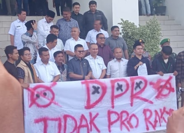 Aksi yang dikawal oleh puluhan polisi itu berlangsung tidak lama. Usai membagikan selebaran tuntutan, para demonstran mengajak anggota DPRD foto bersama di belakang spanduk yang bertuliskan : ‘DPR Tidak Pro Rakyat’.