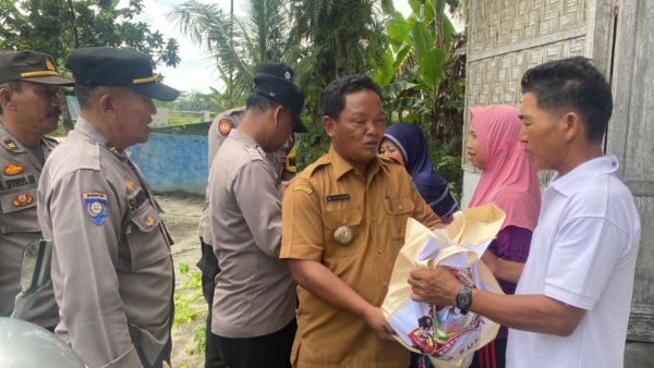 Plt Kapolsek Indrapura diwakili Wakapolsek Iptu Arianto Sitorus SH bersama Kades Aras dan Bhabinsa membagikan sembako kepada warga kurang mampu.