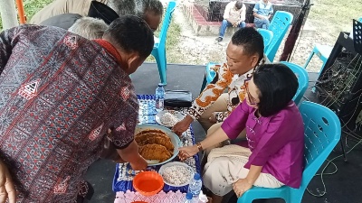 Doa pemberangkatan Caleg DPR RI Tangkas Lumban Tobing ditandai dengan pemberian ‘dekke’ (ikan mas – red) kepada borunya istri Tangkas Lumban Tobing dan keduanya ‘diulosi’ agar tetap tetap sehat, semangat dan kuat menghadapi Pemilu 2024 dan tercapai apa yang dicita citakan.