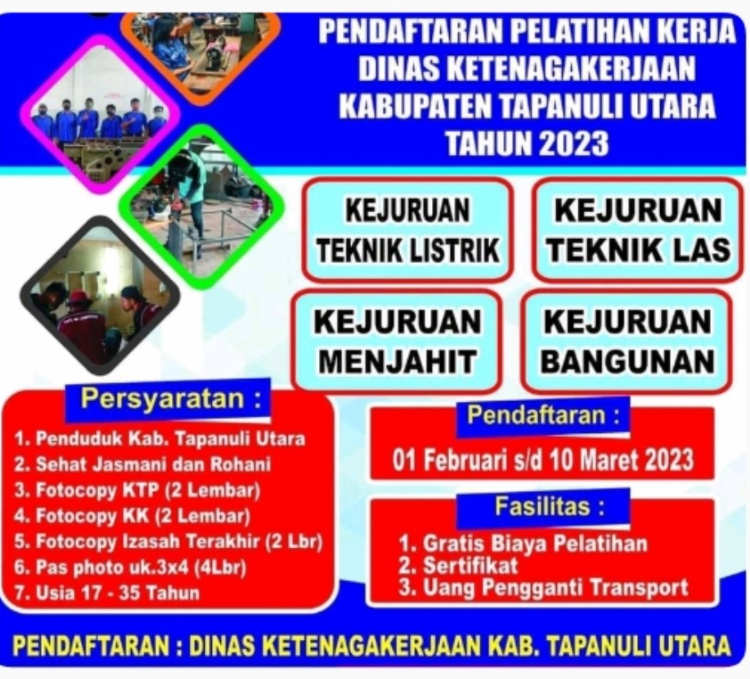 TAPUT (mimbarsumut.com) – Dinas Tenaga Kerja (Disnaker) Kab. Tapanuli Utara (Taput) membuka pendaftaran perekrutan pelatihan kerja 2023.
