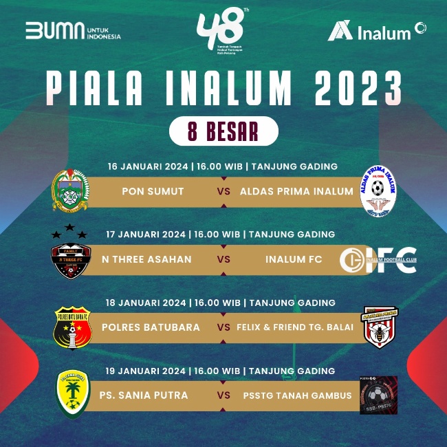 Kedelapan Tim merupakan tim-tim yang telah lolos dari Fase Grup yang telah dilakukan sejak 18 Desember 2023 hingga 30 Desember 2023. Piala INALUM pada tahun ini diikuti oleh 12 Tim. Khusus pada tahun ini, sebanyak 6 tim berasal dari Kabupaten Batubara dan sisanya berasal dari Kabupaten/Kota di luar Batubara. Perhelatan akan dilakukan sejak 19 Desember 2023 hingga 15 Februari 2024 yang merupakan bagian dari rangkaian HUT Ke-48 INALUM. Piala INALUM menjadi jalan perusahaan dalam mewadahi minat dan bakat masyarakat dalam olahraga sepakbola. Kami berharap setiap pertandingan berjalan sportif dan menjunjung fair play