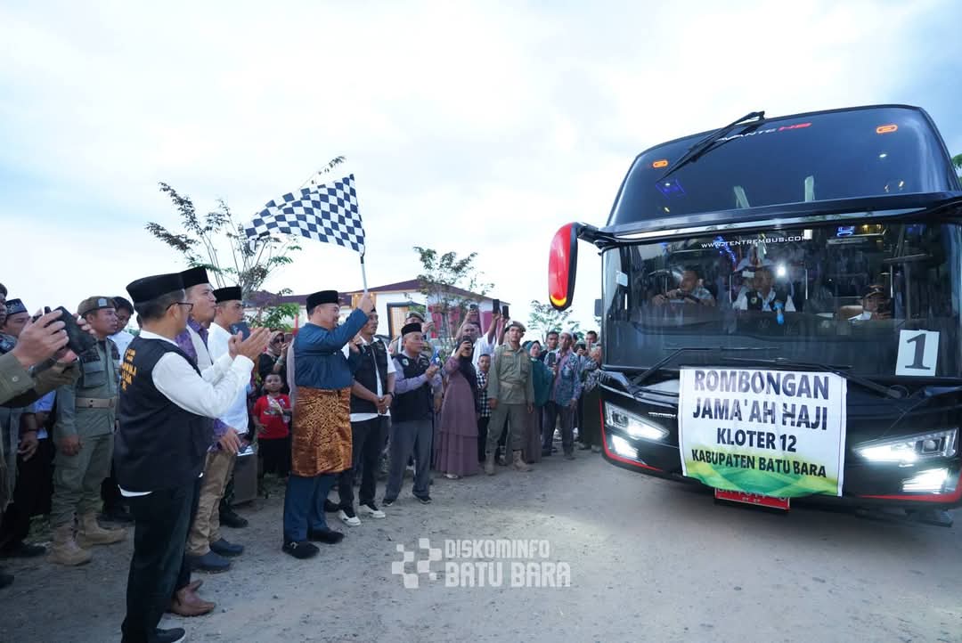 Bupati Batubara H. Baharuddin Siagian, SH, M.Si melepas keberangkatan 275 Jemaah Calon Haji Kabupaten Batubara Kloter 12 di halaman Kantor Bupati Batubara, Rabu (14/05/2025).