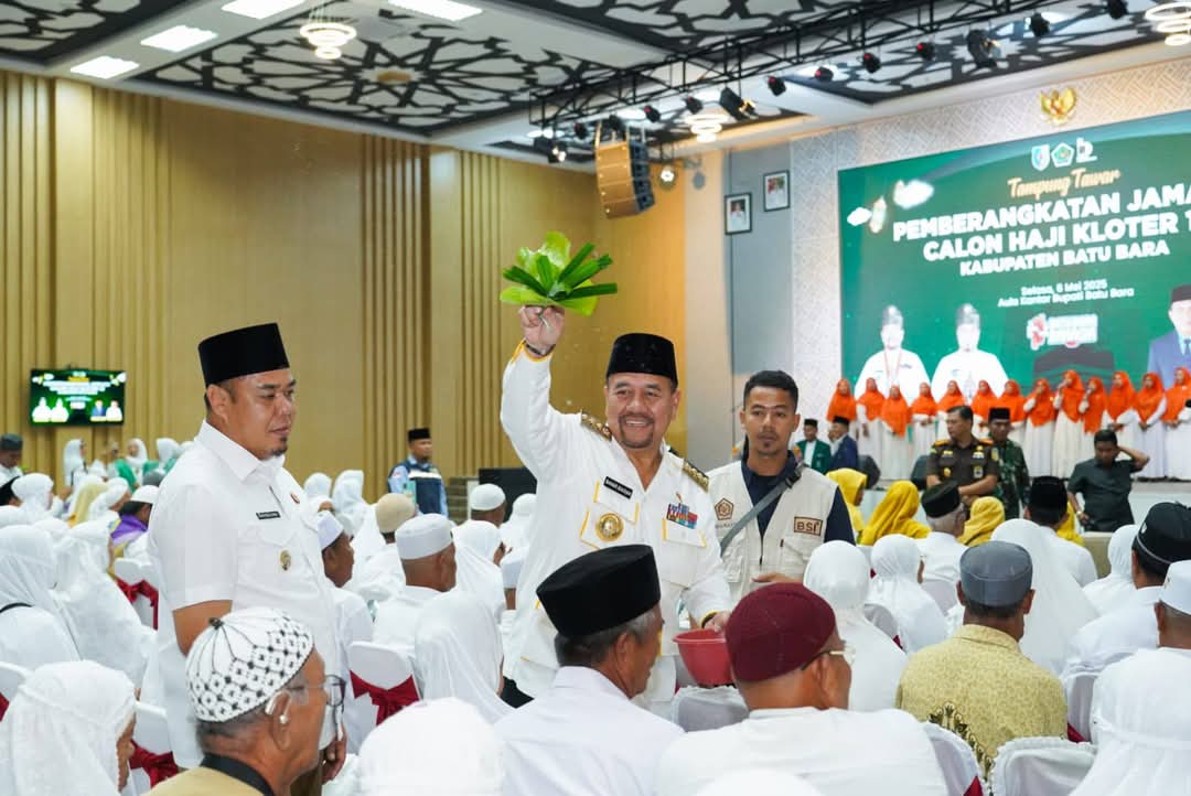 Bupati Batubara H. Baharuddin Siagian, SH, M.Si bersama Wakil Bupati Syafrizal , SE M.AP melaksanakan tampung tawar kepada Jemaah Calon Haji asal Kabupaten Batubara yang digelar di Aula Kantor Bupati, Lima Puluh, Selasa (06/05/2025).