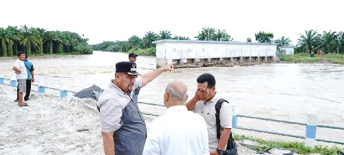 Bupati Batubara H. Baharuddin Siagian SH, MSi bersama anggota DPRD Provinsi Sumatera Utara, Yahdi Khoir, serta Tim Staf Ahli Kementerian Pertanian RI Ibu Ani dan Bapak Aris, meninjau langsung kondisi bendung Sungai Dalu-Dalu yang berada di Desa Sukaraja, Kecamatan Air Putih, Kabupaten Batubara, Sabtu (13/12/2025).