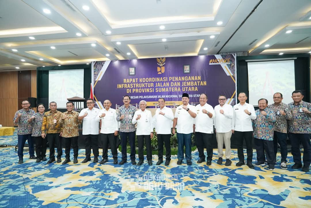 Bupati Batubara H. Baharuddin Siagian, SH, M.Si bersama Plt. Kadis PUTR dan Kepala Bappelitbangda Kabupaten Batubara menghadiri Rapat Koordinasi Penanganan Infrastruktur Jalan dan Jembatan di Provinsi Sumatera Utara yang diselenggarakan di Aula Inna 2 Hotel Grand Inna . Jl. Balai Kota No. 2 Kesawan Medan, Rabu (14/05/2025).