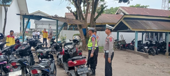 Personil Satlantas mengimbau siswai/i SMPN 1 Limapuluh agar tidak menggunakan knalpot brong/ tidak sesuai spesifikasi