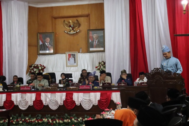 Pj Bupati Batubara Heri Wahyudi Marpaung memberikan sambutan pada rapat paripurna istimewa, pada hari jadi ke 18 tahun Kabupaten Batubara, Senin (9/2/2024)