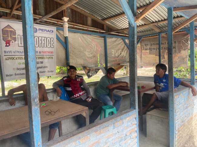 Personil Sat samapta Polres Batubara Bripka M Fadly dan Bripda Anju melaksanakan patroli dialogis sekaligus cooling system jelang pilkada 2024 di salah satu warung diseputaran Tanah Merah kecamatan Air Putih kabupaten Batubara, Sabtu (13/07/2024).