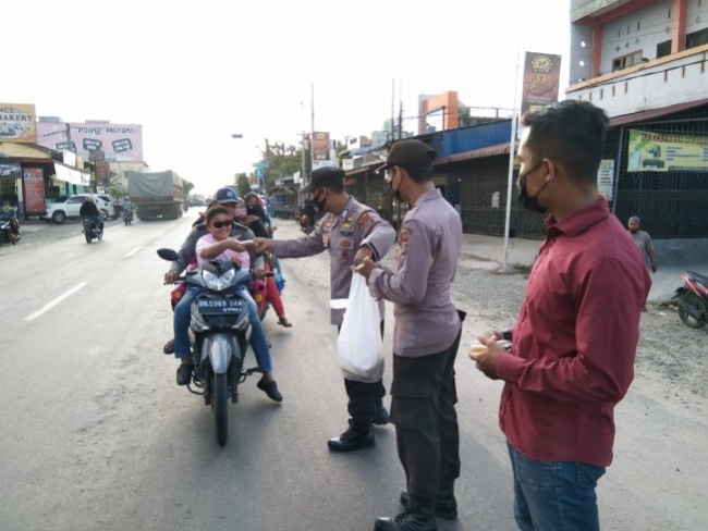 Personel Polsek Indrapura membagikan Takjil kepada warga yang melintas