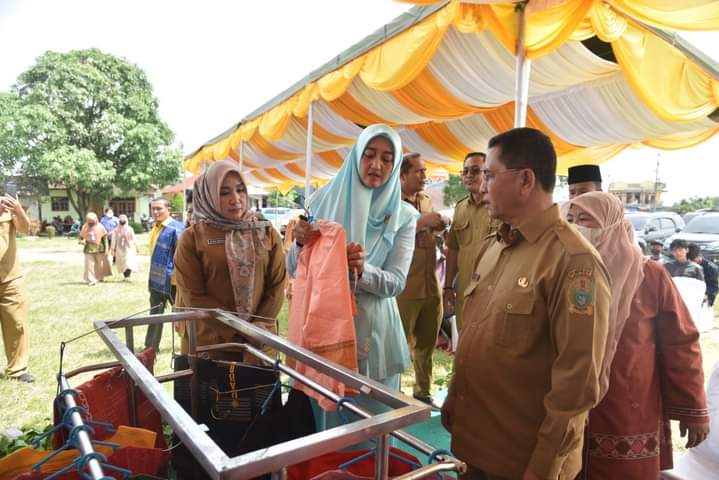 Ketua Dekranasda Batubara Ny Maya Indriasari tampak sedang memperhatikan hasil tenun tekun
