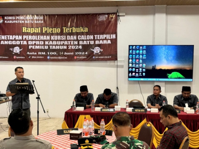 Komisi Pemilihan Umum (KPU) Kabupaten Batubara menggelar pleno perolehan kursi dan penetapan anggota DPRD Batubara terpilih periode 2024-2029 di aula RM 100 Jalinsum Desa Tanjung Gading Kecamatan Sei Suka Kabupaten Batubara, Jumat (14/6/24) malam.