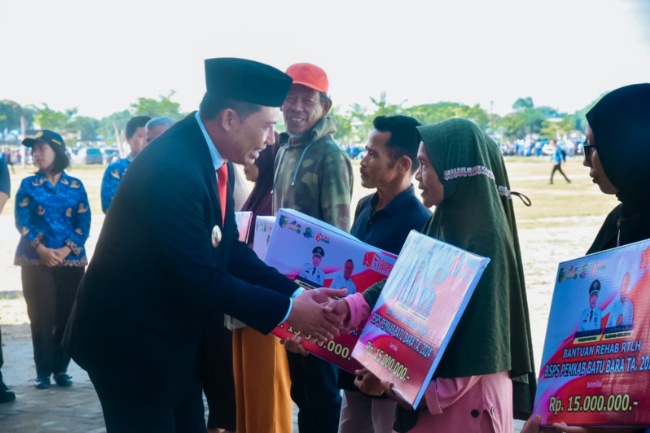 Penjabat (Pj) Bupati Batubara H. Heri Wahyudi Marpaung, S.STP, M.AP., menyerahkan bantuan bedah rumah kepada 100 penerima perbaikan Rumah Tidak Layak Huni (RTLH) pada momen upacara peringatan Hari Pahlawan, Senin (11/11/2024).
