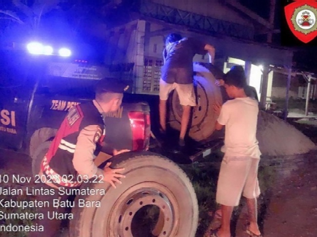 Personil Sat Samapta Polres Batubara yang sedang melaksanakan patroli membantu seorang supir truk yang mengalami pecah ban di Jalinsum Desa Sumber Padi, Kecamatan Limapuluh, Kabupaten Batubara, Kamis, (10/11/2023), Pukul 02.00 WIB