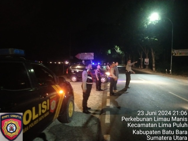 Personil Sat Samapta bersama personil Polres Batubara yang tersprint melaksanakan patroli gabungan jaga Kamtibmas serta Antipasi berbagai tindak kejahatan, Minggu (13/6/2024) pukul 20.30 WIB