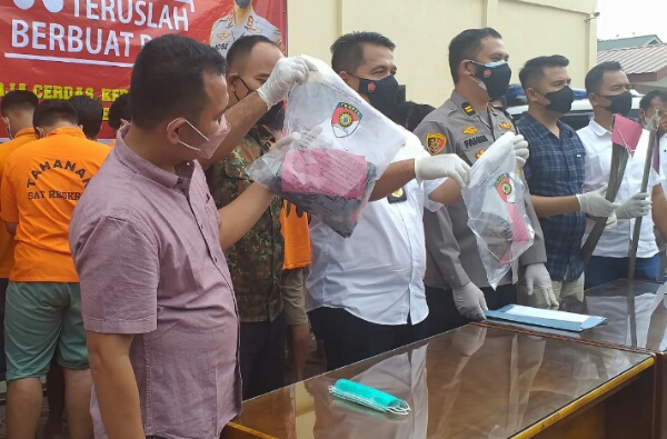 Kasat Reskrim dan Kasi Humas Polres Batubara serta lainnya memperlihatkan barang bukti dan para pelaku penganiayaan