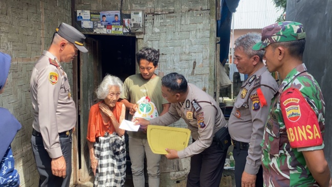 Selanjutnya Kapolsek mendatangai kediaman nek Inem lansia berusia 96 tahun yang tinggal bersama cucunya dan memberikan sembako dan taliasih kepada nek Inem.