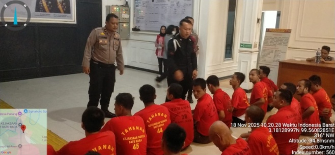 Personil Polsek Labuhan Ruku Briptu M. Rinaldi melakukan pengamanan di Lapas Kelas II A Labuhan Ruku Kab Batubara, Selasa(18/11/2025) pukul 10.39 WIB sampai selesai.