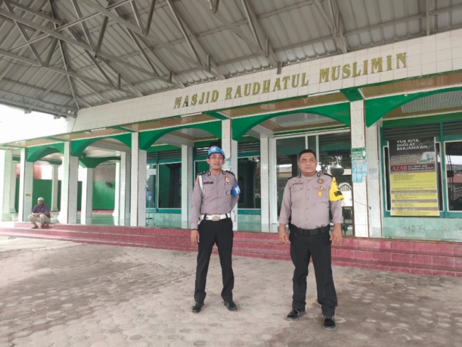 Personil Polsek Medang Deras Polres Batubara melaksanakan pengamanan Sholat Jumat di Masjid Raudatul Muslimin di Kelurahan Pangkalan Dodek Baru Kec.Medang Deras Kab.Batubara, Jumat, (22/9/2023)