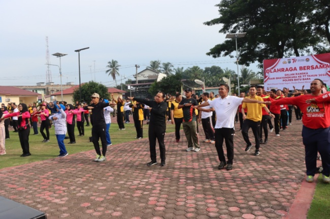 “Bertepatan hari ini kita melaksanakan kegiatan olahraga bersama untuk menyambut dan memeriahkan HUT Bhayangkara ke 77 Tahun 2023,dengan tema “POLRI PRESISI UNTUK NEGERI PEMILU DAMAI MENUJU INDONESIA EMAS”. Dengan diadakannya olahraga bersama ,maka Polres Batubara sangat mendukung salah satu poin dari pada Nawacita Presiden Republik Indonesia Ir. H Joko Widodo pada poin 5 yaitu Meningkatkan Kualitas Hidup Manusia Indonesia,” ucap Zahir