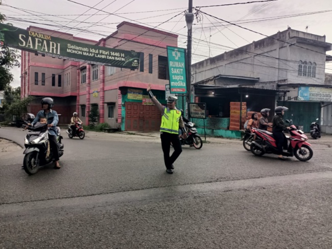 Sat Lantas Polres Batubara kembali melaksanakan pengaturan arus lalulintas, Sabtu (12/4/2025) pagi meski cuaca hujan
