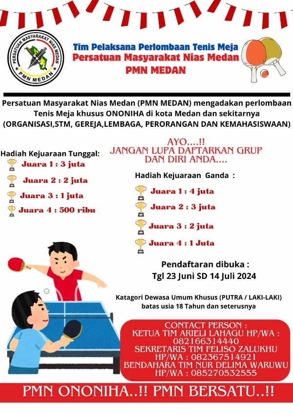 MEDAN (mimbarsumu.com) – Persatuan Masyarakat Nias (PMN) Medan gelar pagelaran tari Maena khas Nias juga pertandingan olahraga cabang tenis meja, Kamis (04/04/2024), di PRSU Medan.