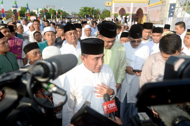 “Idul Adha ini adalah momen kita kembali mengingat dan meneladani kisah Nabi Ibrahim, tentang ketaatannya kepada Allah SWT. Nabi Ibrahim rela mengurbankan anaknya atas perintah Allah. Itulah teladan yang bisa kita petik dari Hari Raya Kurban ini,” kata Gubernur Edy Rahmayadi usai melaksanakan Salat Idul Adha 1444 H bersama ribuan warga Kota Medan dan sekitarnya di Lapangan Sepak Bola Mabar, Jalan Mangaan, Medan Deli, Kamis (29/6/2023)