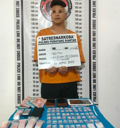Kapolres Pematangsiantar AKBP Sah Udur T.M Sitinjak SH. SIK. MH bersama Kasat Resnarkoba AKP Jonny Hasudungan Pardede SH pimpin penangkapan seorang pengedar sabu berinisial FIS (30) di Jalan Nagur Gg. Erlangga Kelurahan Martoba Kecamatan Siantar Utara Kota Pematangsiantar, Jumat 11 April 2025.