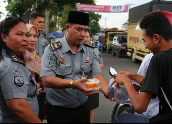 Sebanyak 300 paket takjil dibagikan kepada warga sekitar serta masyarakat yang melintasi jalan raya di depan Lapas Pematangsiantar. Kepala Lapas Pematangsiantar, M. Pithra Jaya Saragih bersama segenap jajaran terjun langsung ke lapangan bagikan paket takjil kepada masyarakat yang melintas.