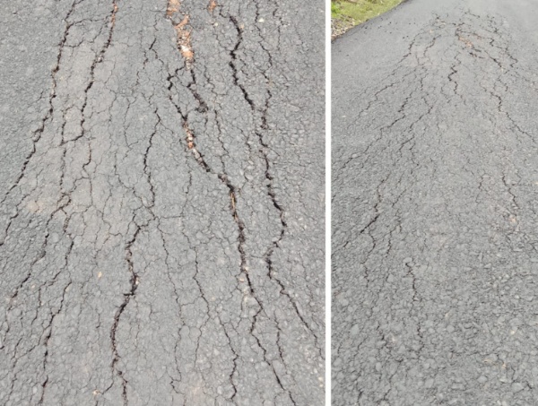 Adanya kerusakan di beberapa titik diduga karena bangunan jalan aspal hotmik tersebut kurang berkualitas dan dalam pengerjaannya diduga kurang pengawasan yang ekstra dari pihak terkait.