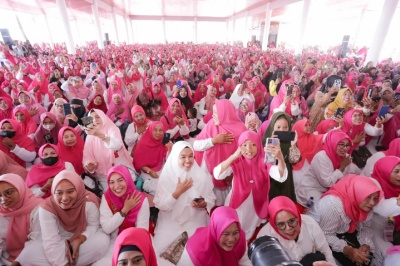 Puluhan ribu kaum ibu pengajian Majelis Ta’lim Muslimah Dambaan tumpah ruah di areal Pantai Romantis Sergai. Kaum ibu pengajian kompak mengenakan busana muslimah berwarna putih dan kerudung merah muda.