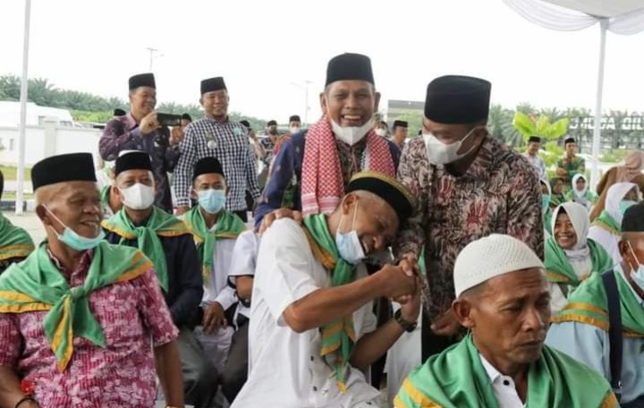 SERGAI (mimbarsumut.com) – Suasana haru bahagia mewarnai pelepasan 74 calon jamaah haji (cjh) asal Kabupaten Serdang Bedagai di pelataran Masjid Agung, Sabtu (11/6/2022).