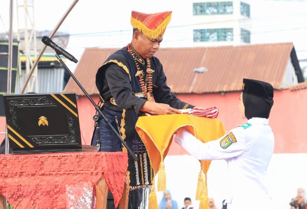 Bupati Sergai H. Darma Wijaya tampil gagah dengan busana adat Pakpak saat memimpin jalannya upacara sebagai inspektur. Suasana semakin sakral ketika Ketua DPRD Sergai Togar Situmorang membacakan naskah proklamasi.