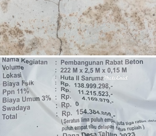 Padahal, bangunan tersebut baru selesai dikerjakan. Namun, rabat beton dengan volume 222 M x 2.5 M x 0.15 M di Dusun atau Huta 2 Sayur Matinggi itu sudah mengalami keretakan dan pecah di beberapa titik.