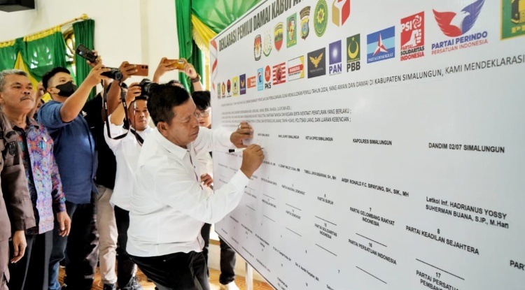 Penandatangan tersebut berlangsung dalam rapat Deklarasi Pemilu Damai Kabupaten Simalungun Tahun 2024, di gedung MUI Simalungun, Jalan Asahan, Kecamatan Siantar, Simalungun, Sumut, Kamis (12/10/2023).