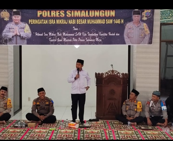 SIMALUNGUN (mimbarsumut.com) – Polres Simalungun menggelar peringatan Isra Mi’raj Nabi Muhammad SAW 1446 H di Masjid Nur Hidayah Polres Simalungun, Rabu (12/2) pagi dengan mengangkat tema “Hikmah Isra Mi’raj Nabi Muhammad SAW Kita Tingkatkan Kualitas Ibadah dan Kinerja Guna Menjadi Polri Presisi Indonesia Maju.”
