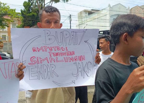 SIMALUNGUN (mimbarsumut.com) – Aksi unjuk rasa puluhan mahasiswa dan beberapa orangtua siswa/i yang tergabung dalam Gerakan Mahasiswa Merdeka Untuk Rakyat, Jumat (12/9/2025) di depan Kantor Kejaksaan Negeri Simalungun nyaris ricuh saat hendak menerobos gedung dengan membawakan isu ‘Pendidikan Kab. Simalungun Diamputasi’, ‘Jaksa Mandul segera tangkap dan adili Vendor’.