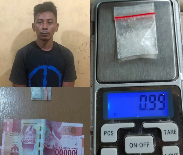 “Setelah dilakukan pemeriksaan terhadap, DI (40) warga Dusun Ulu, Kecamatan Ujung Padang Kabupaten Simalungun, dan ditemukan 1 bungkus plastik klip transparan yang berisi diduga narkotika jenis sabu dengan berat brutto 0,99 gram serta uang sejumlah Rp.300.000.