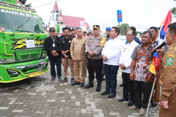 Sebelum beranjak melakukan peninjauan, saat berada di Kantor Camat Purba, Bupati memberangkatkan logistik Pemilu menuju TPS yang berada di nagori (desa).
