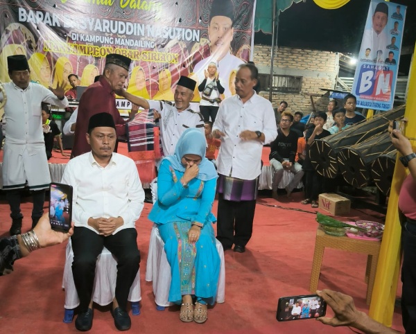 TEBINGTINGGI (mimbarsumut com) – Bacalon Walikota Tebingtinggi Sumatera Utara Basyaruddin Nasution SH.MH dan istri Denilah Shofa SH.MKn hadiri acara Gondang Sembilan yang diadakan keluarga besar rumpun Mandailing Pakantan Kelurahan Mandailing, Kecamatan Tebingtinggi Kota, Kota Tebingtinggi Sumut, Sabtu 22 Juni 2024.