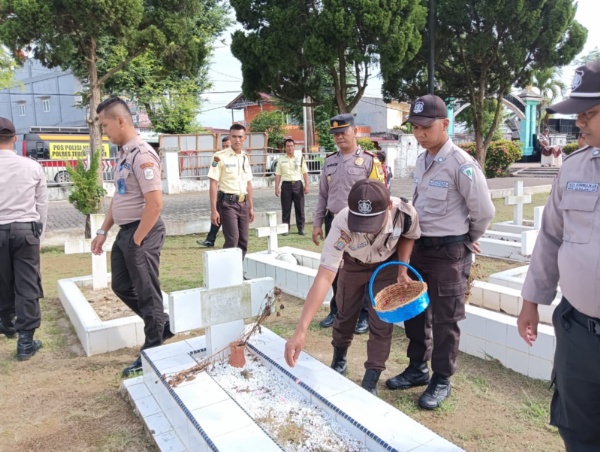 TEBINGTINGGI (mimbarsumut.com) – HUT Satuan Pengaman (Satpam) ke 43 Tahun 2023, Polres Tebingtinggi bersama Satpam yang bertugas di wilayah hukum Polres Tebingtinggi melaksanakan ziarah dan tabur bunga di Makam Pahlawan, Jalan Taman Bahagia Kota Tebingtinggi, Sabtu (30/12/23).