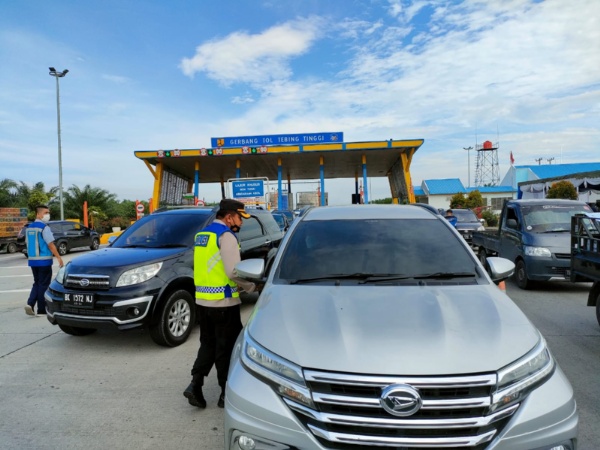 Satu persatu kenderaan / pemudik yang masuk dari pintu tol maupun pengendara kenderaan bermotor dari jalur Jalinsum, wajib diperiksa apakah sudah divaksin atau belum.