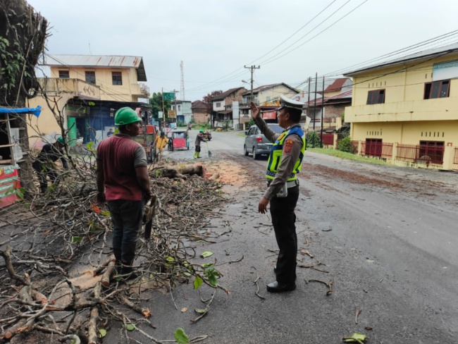 Kegiatan dilaksanakan oleh Kanit Kamsel Ipda Alan, S.H. bersama Bripka R. Pasaribu. Dalam kesempatan tersebut, petugas memberikan himbauan kepada pekerja yang sedang melakukan pemangkasan pohon di tepi jalan agar berhati- hati saat bekerja.