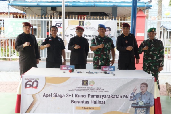 TEBINGTINGGI (mimbarsumut com) – Apel Siaga 3 + 1 Kunci Pemasyarakatan Maju Brantas Halinar Bersama Aparat Penegak Hukum (APH) setempat dalam rangkaian Hari Bakti Pemasyarakatan ke 60 Tahun 2024 digelar di Lapangan apel Lembaga Pemasyarakatan Kelas IIB Tebingtinggi, Jumat (05/04/2024).