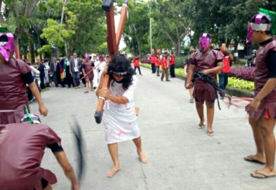 Sepanjang perjalanan Jalin Salib, menuju lokasi gedung, menjadi tontonan warga yang melintas dan tidak sedikit warga mengabadikannya. Terlihat Yesus yang memikul salib, selalu dicambuk hingga terjatuh.